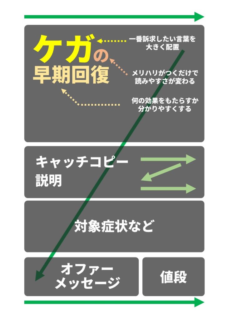 お気づきの先生も多いとは思いますが、値段の訴求は右下が一番配置としては良いです。目の動きから考えれば、左から右へと移動させていき、最終的にオファーが分かるようにしておくだけで反応率は変化してきます。そのため、どの形で作っても右下に値段が基本となります。